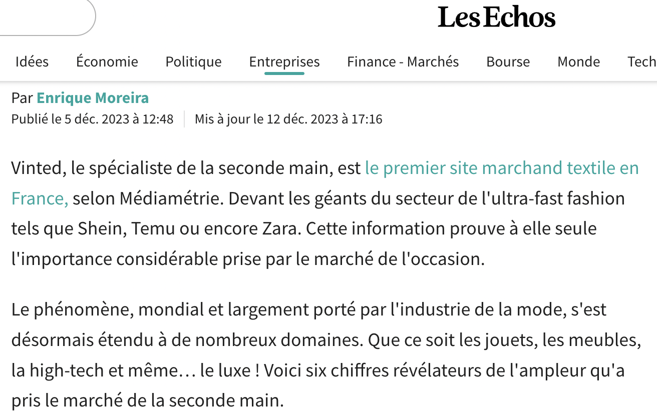 Vinted est d'ailleurs le premier site marchand textile en France devant des géants comme Shein ou Zara.
